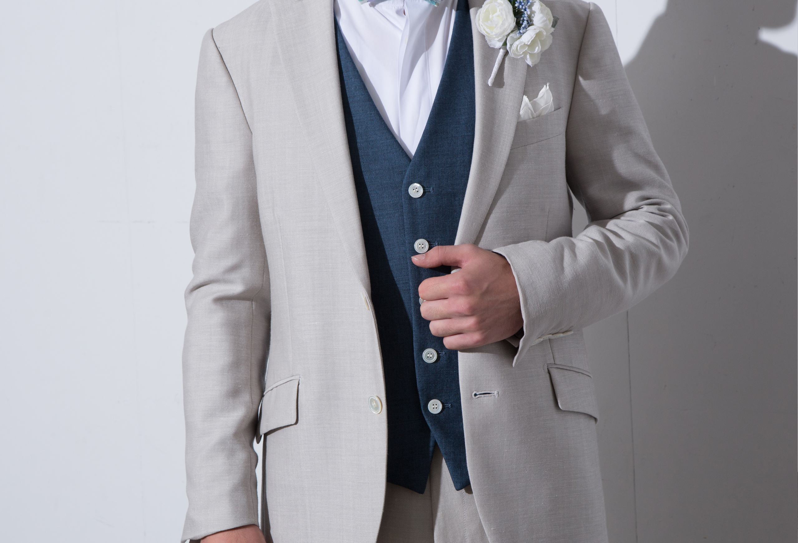 挙式パーティや二次会、海外ウェディングまで幅広く活躍しそうなウール、モヘア混の上質素材感が生きるオリジナルタキシード。グレーシュベージュに白の貝ボタンが爽やか。ピークドラペルでフォーマルに。ブルーパターンもあり、セットアップの組み替えが可能。